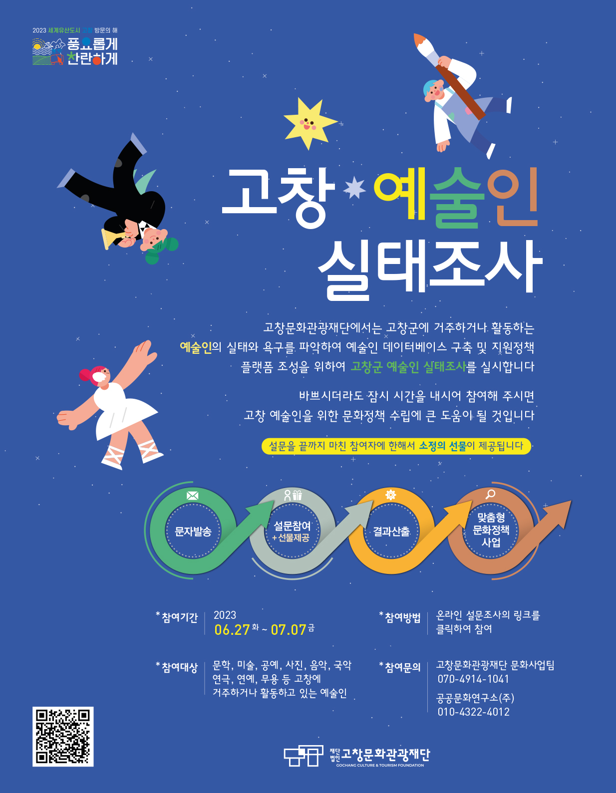 (재)고창문화관광재단은 고창군 예술인의 실태와 욕구를 파악하고 이를 바탕으로 예술인 데이터베이스 구축 및 지원정책의 방향을 설계하고자 예술인 실태조사를 실시합니다.