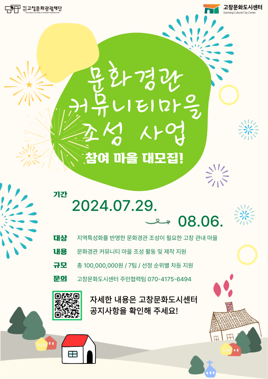 마을을 주민들의 정서적인 치유공간으로 만들기 위한 문화경관 커뮤니티마을 조성사업의 대상 마을을 모집하고자 합니다.