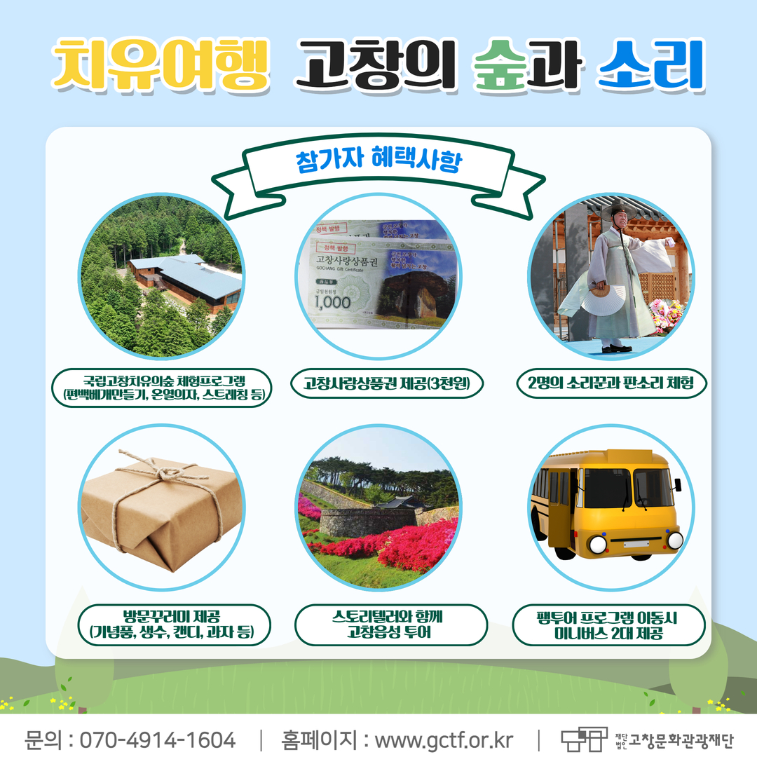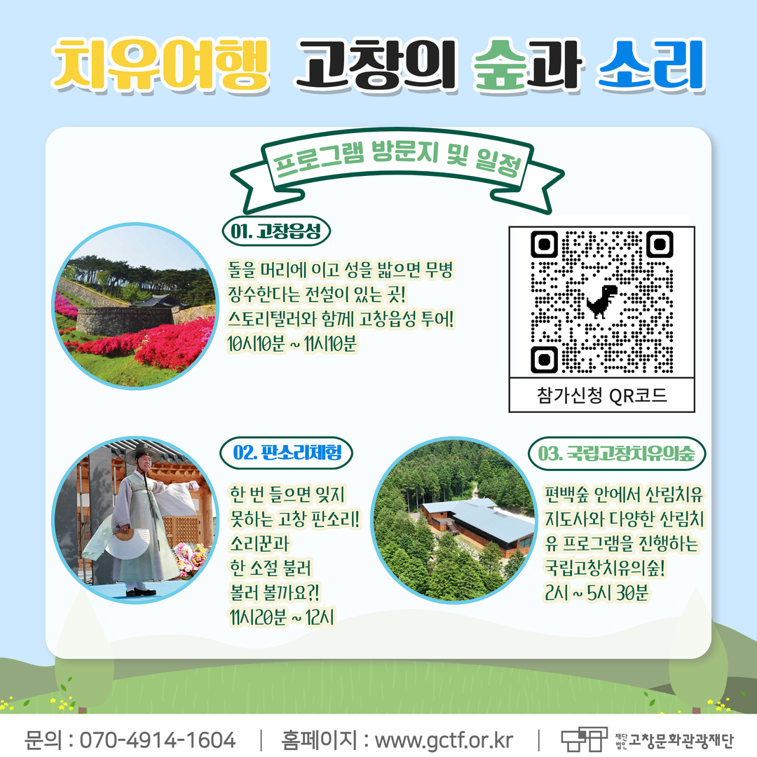 (재)고창문화관광재단은 고창 생물권보전지역의 풍부한 자연과 문화 자원을 활용하여, 지역의 고유한 매력을 널리 알리고자‘치유여행 – 고창의 숲과 소리’ 웰니스 프로그램을 운영합니다. 고창의 특별한 매력을 함께 나누실 분들의 많은 관심과 참여 부탁드립니다.