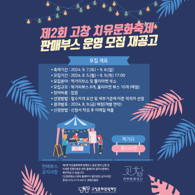 (재)고창문화관광재단·고창문화도시센터는 제2회 고창 치유문화축제를 찾는 주민들과 관광객을 대상으로 다양한 먹거리, 볼거리, 즐길 거리를 제공하기 위하여 축제기간 동안 운영될 판매부스 운영자(단체)를 모집합니다. 많은 관심과 참여바랍니다.
