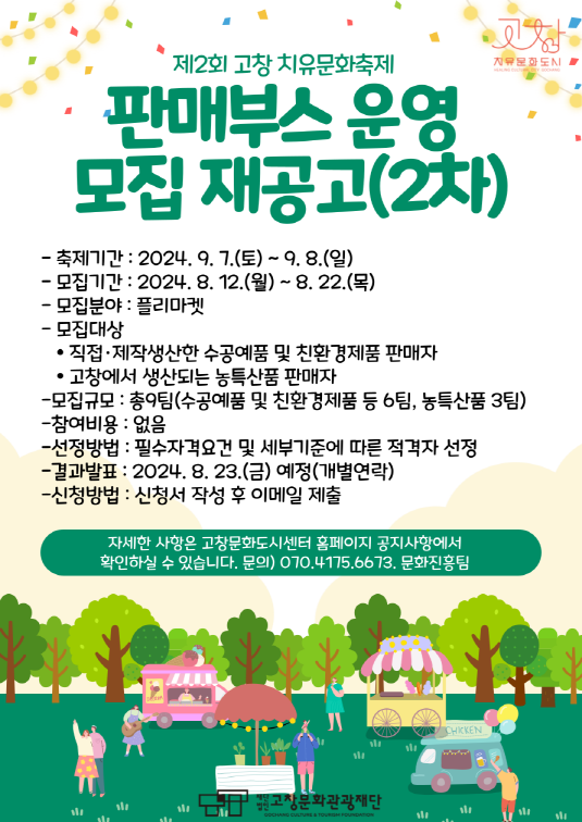 (재)고창문화관광재단·고창문화도시센터는 제2회 고창 치유문화축제를 찾는 주민들과 관광객을 대상으로 다양한 먹거리, 볼거리, 즐길 거리를 제공하기 위하여 축제기간 동안 운영될 판매부스 운영자(단체)를 모집합니다. 많은 관심과 참여 바랍니다.