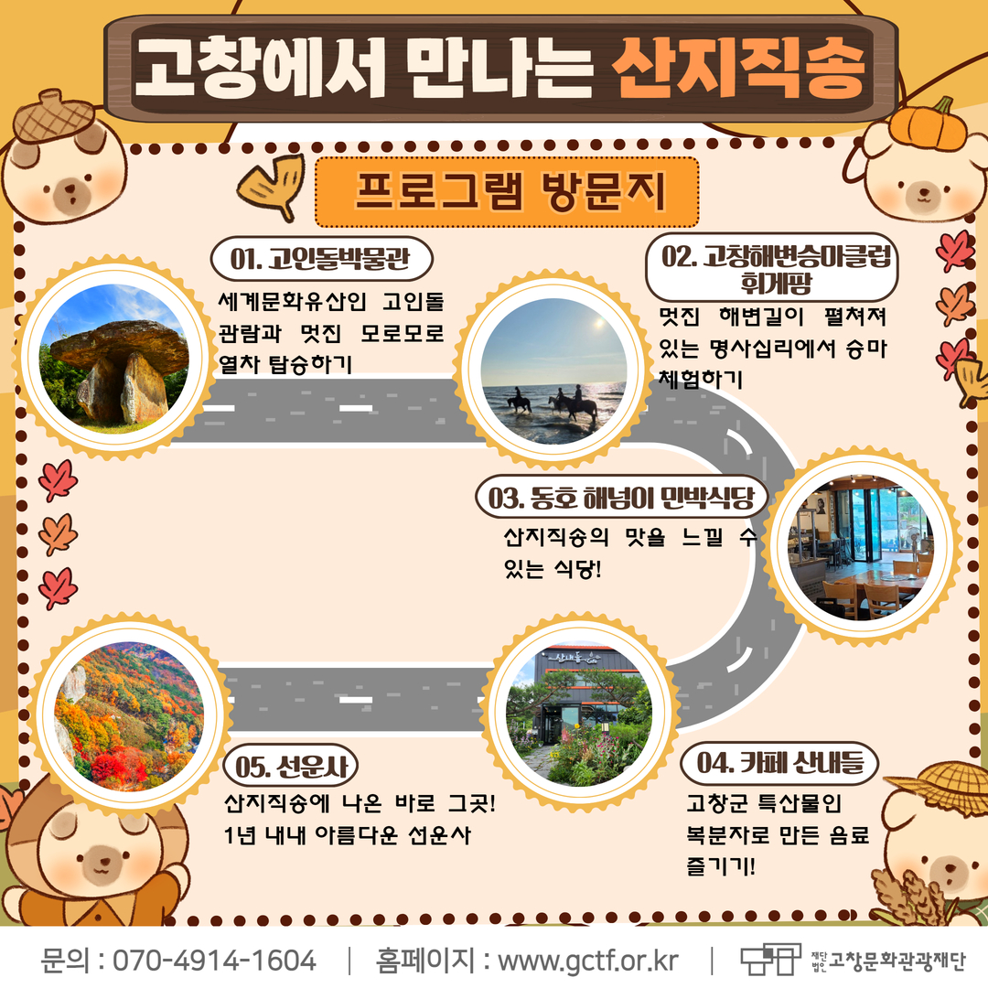 (재)고창문화관광재단은 고창 생물권보전지역의 풍부한 자연과 문화 자원을 활용하여, 지역 관광 활성화를 위한‘고창에서 만나는 산지직송’팸투어를 진행합니다. 이번 팸투어는 고창의 특산물을 이용한 음식들과 최근 방송에 나온 관광지와 더불어 명사십리 해변에서 승마체험을 하는 프로그램으로 구성되어 있어 참여자들에게 고창의 고유한 매력을 소개하고자 합니다. 많은 관심과 참여 부탁드립니다.