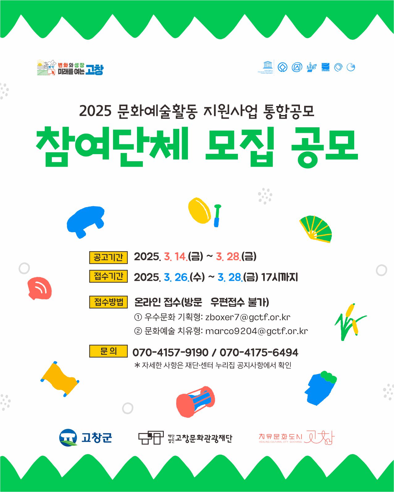 '2025 문화예술활동 지원사업 통합공모'를 추진하오니 많은 관심과 참여를 바랍니다.