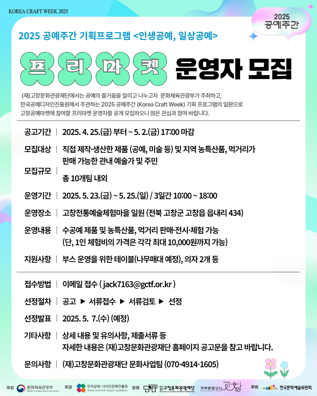 고창공예마켓에 참여할 프리마켓 운영자를 공개 모집하오니 많은 관심과 참여 바랍니다.