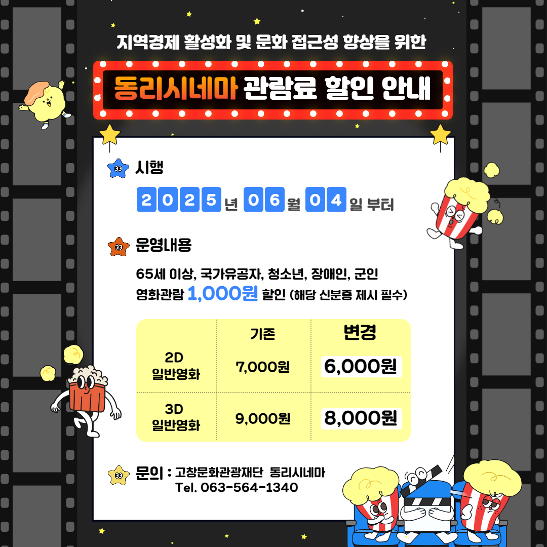 전북 고창군 동리시네마가 사회적 우대계층인 65세 이상 어르신을 비롯해 국가유공자, 청소년, 장애인, 군인 등에 관람료를 7000원에서 6000원으로 할인해 준다고 2일 밝혔다.