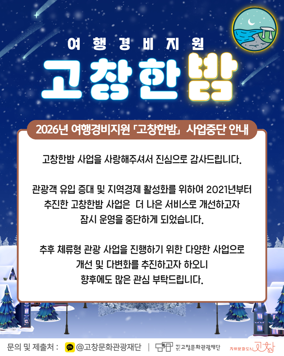 [안내]2026년 여행경비지원 고창한밤 사업 일시 중단 안내