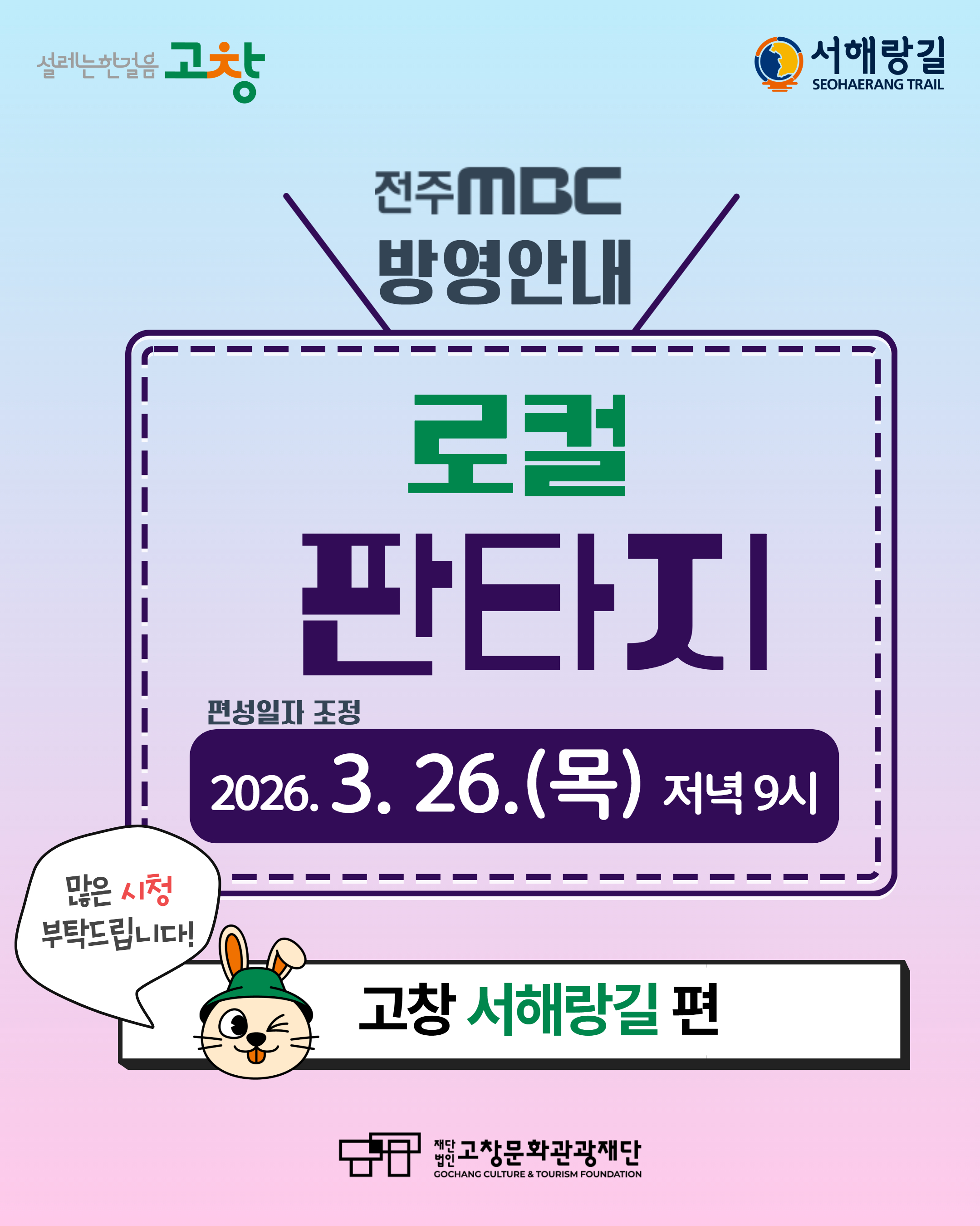 [안내]전주MBC '로컬 판타지' 고창 서해랑길 편 방영 안내(2026.3.26.(목) 저녁 9시 방영)*편성일자 조정