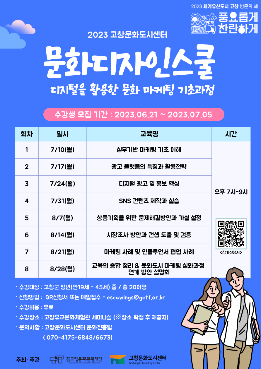 고창문화도시센터는 <치유문화도시 고창 시민문화디자이너 스쿨> 사업의 일환으로 "문화디자인 스쿨- 디지털을 활용한 문화 마케팅 기초과정"을 진행합니다.