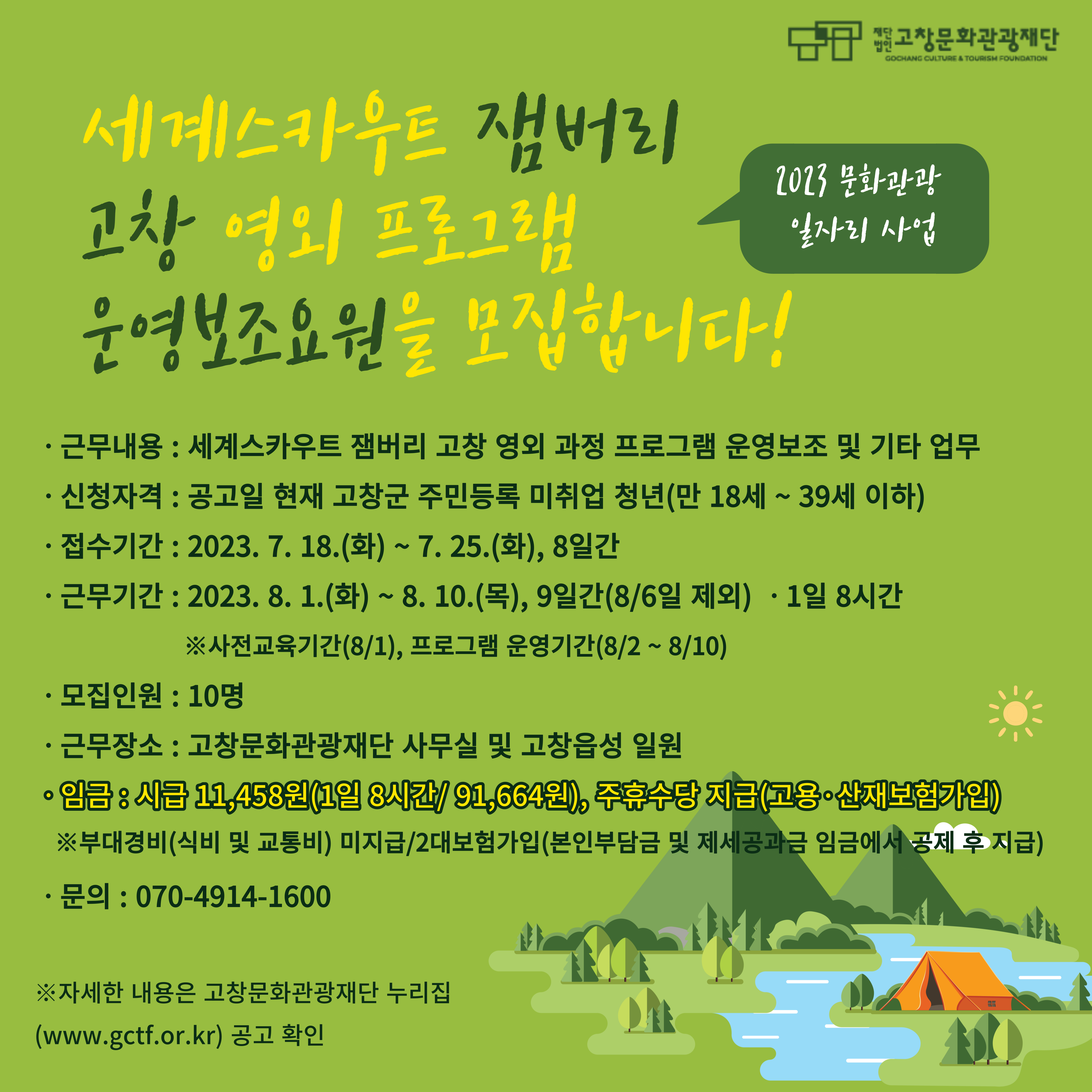 지역 내 대학생 및 청년들에게 다양한 사회경험 및 문화·예술·관광 분야 진로 탐색의 기회를 제공하기 위해 추진하고 있는 「2023년 문화관광 일자리 사업」 참여자를 아래와 같이 모집합니다.