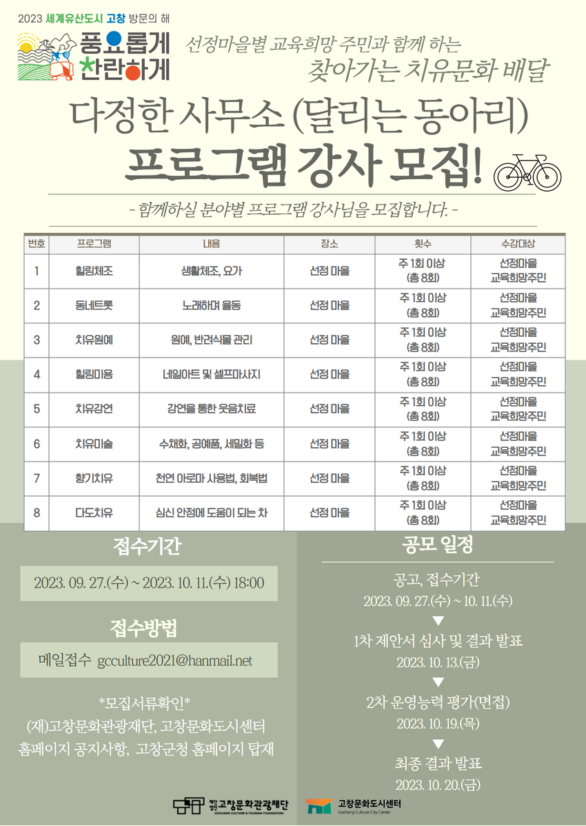 고창문화도시는 문화 소외지역의 문화향유기회 확대를 위해 '찾아가는 우리동네 치유문화 배달'사업의 일환으로 치유문화 교육프로그램을 진행하여 지역간 문화 격차를 해소할 수 있도록 8개 분야의 문화예술 교육프로그램을 선정 마을별로 진행하고자 합니다.