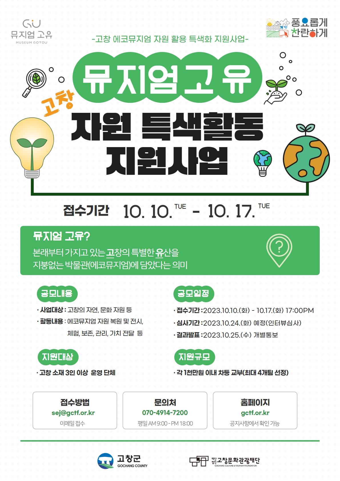 (재)고창문화관광재단은 고창의 다양한 자연 문화유산을 보존 및 활용하는 특색활동을 지원함으로써 고창의 유산과 사람이 조화를 이루는 만난의 장인 '뮤지엄 고유'를 조성하는 지원사업에 참여할 단체를 공개 모집합니다