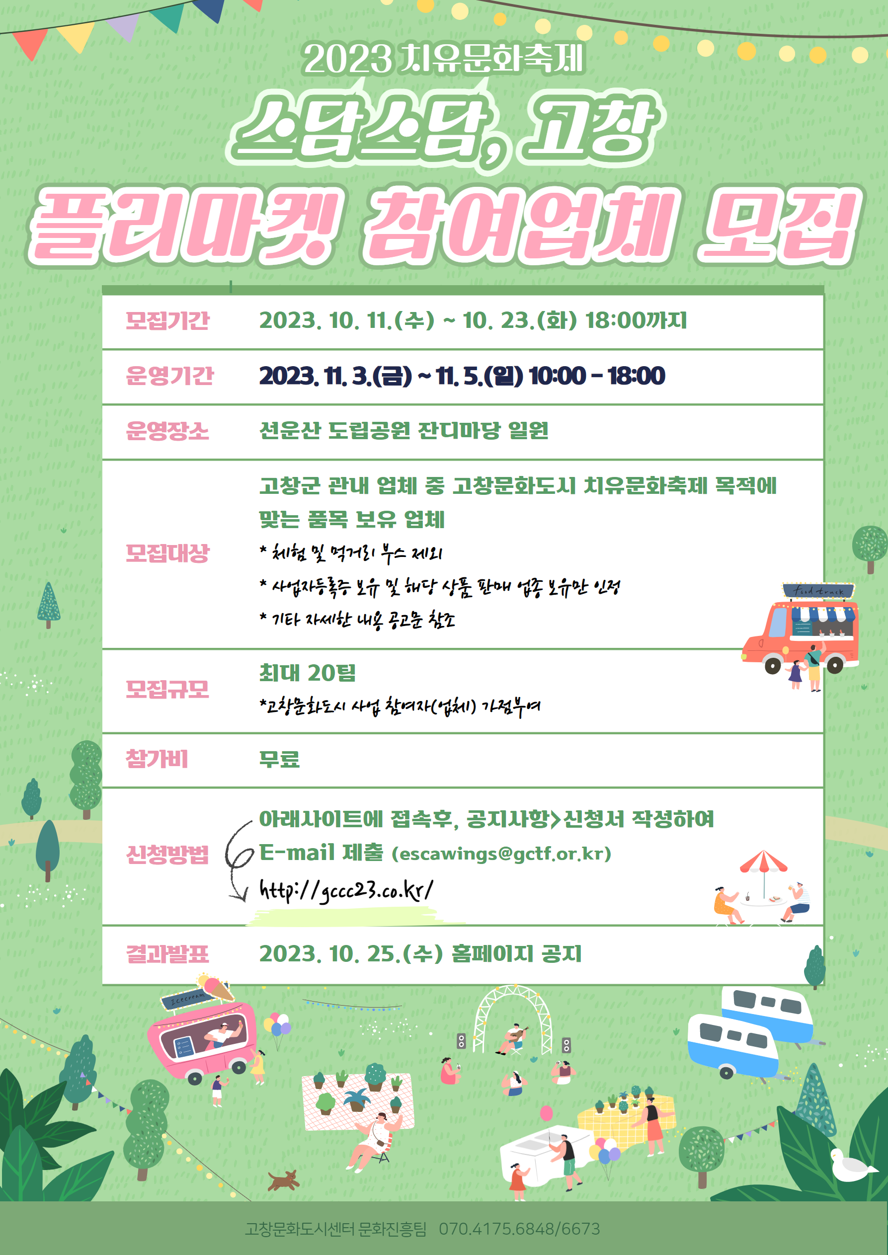 (재)고창문화관광재단·고창문화도시센터는 2023년 11월 3일 ~ 5일에 개최되는 “2023 고창문화도시 치유문화축제 : 스담스담, 고창”에서 치유문화도시 고창의 브랜드를 확산할 수 있는 플리마켓 참여업체 모집을 공고하니, 관심 있는 지역 판매자들의 많은 참여 바랍니다.