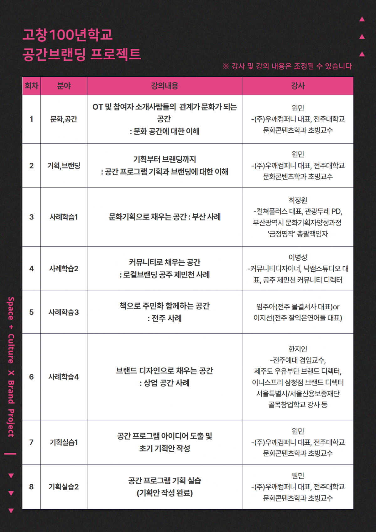 공간과 문화기획 및 브랜딩 전문가의 교육과 함께, 문화기획 실습으로 공간브랜딩 프로젝트에 참여하게 됩니다.