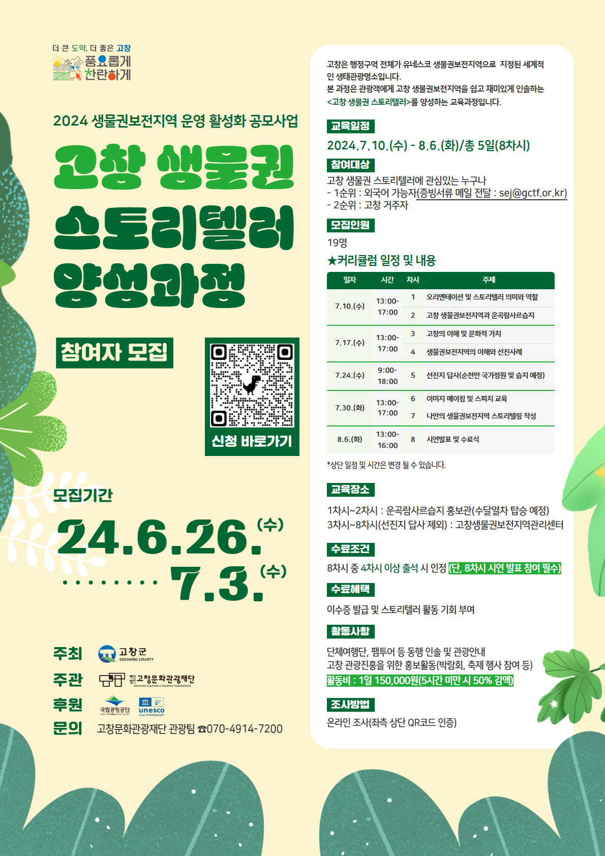 (재)고창문화관광재단은 2024 생물권보전지역 운영 활성화 공모사업의 일환으로 ‘2024 고창 생물권 스토리텔러 양성과정’을 운영합니다. 고창 생물권보전지역을 쉽고 재밌게 안내하는 <고창 생물권 스토리텔러> 양성과정에 많은 관심과 참여 바랍니다.