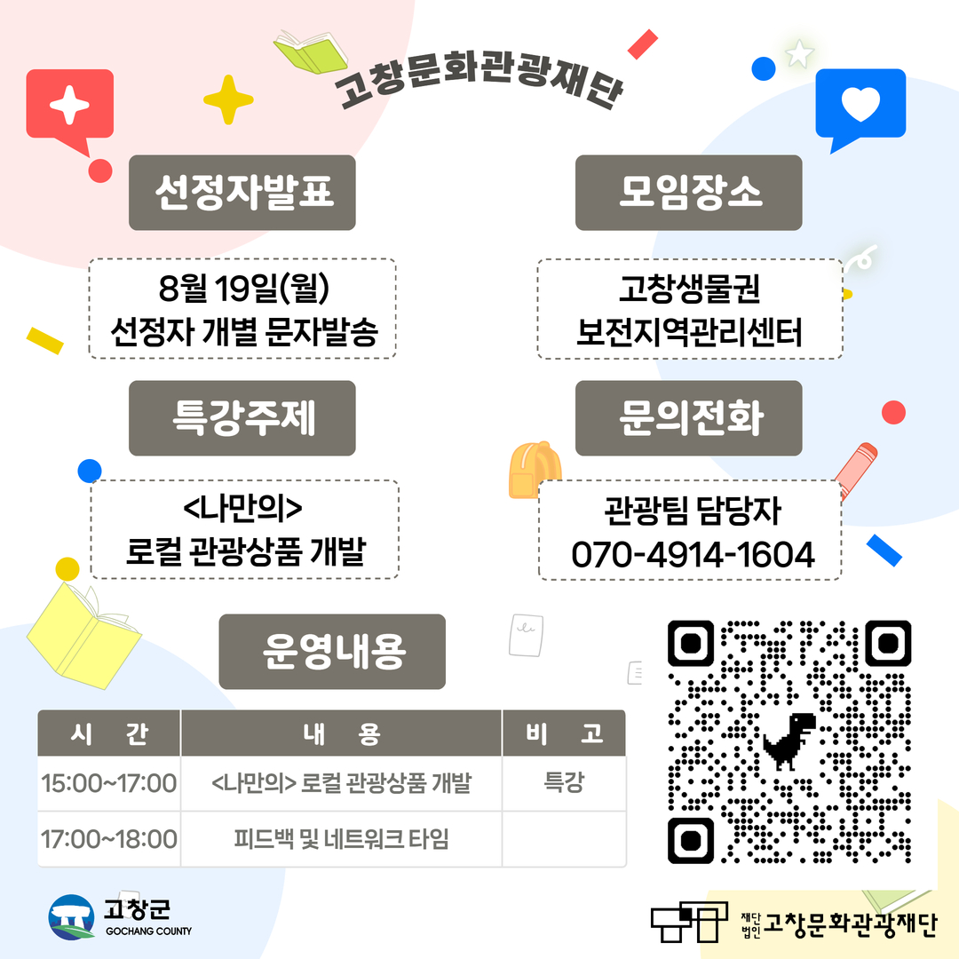 (재)고창문화관광재단은 고창의 관광산업 발전을 도모하기 위해 고창 관광산업 네트워크(8월) 참가자를 모집합니다. 지역 사회와 관광산업의 발전을 위해 열정적으로 노력하는 분들의 소통과 공유의 장을 마련하고자 하오니 많은 관심과 참여 부탁드립니다.