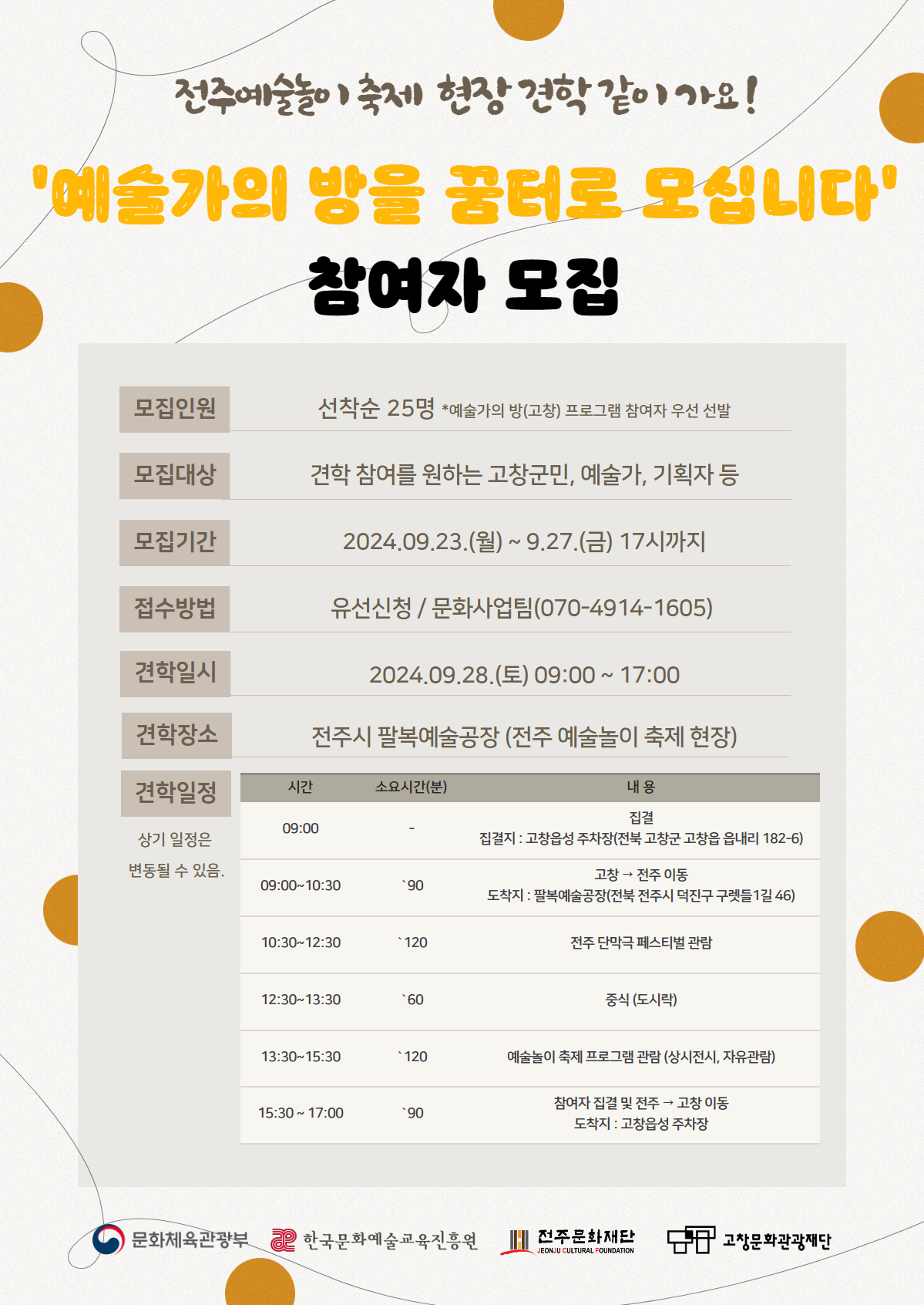 (재)고창문화관광재단은 전북권 문화예술 교류 협력사업 2024 예술로 어울림 특화선도형의 일환으로 ‘예술가의 방을 꿈터로 모십니다’를 운영합니다.