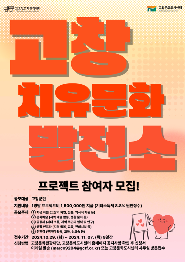 고창문화도시센터에서 고창의 치유문화 발전을 함께 만들어 갈 참여자를 모집합니다! 고창 치유문화 발전소는 고창의 고유한 자연, 전통, 예술, 친환경 자원등을 활용하여, 주민들이 주도적으로 치유와 문화가 결합된 창의적 프로젝트를 기획하고 실행하는 프로그램입니다. 나의 아이디어로 고창의 치유문화를 발전시키고자 하는 분들의 많은 관심과 참여를 기다립니다.