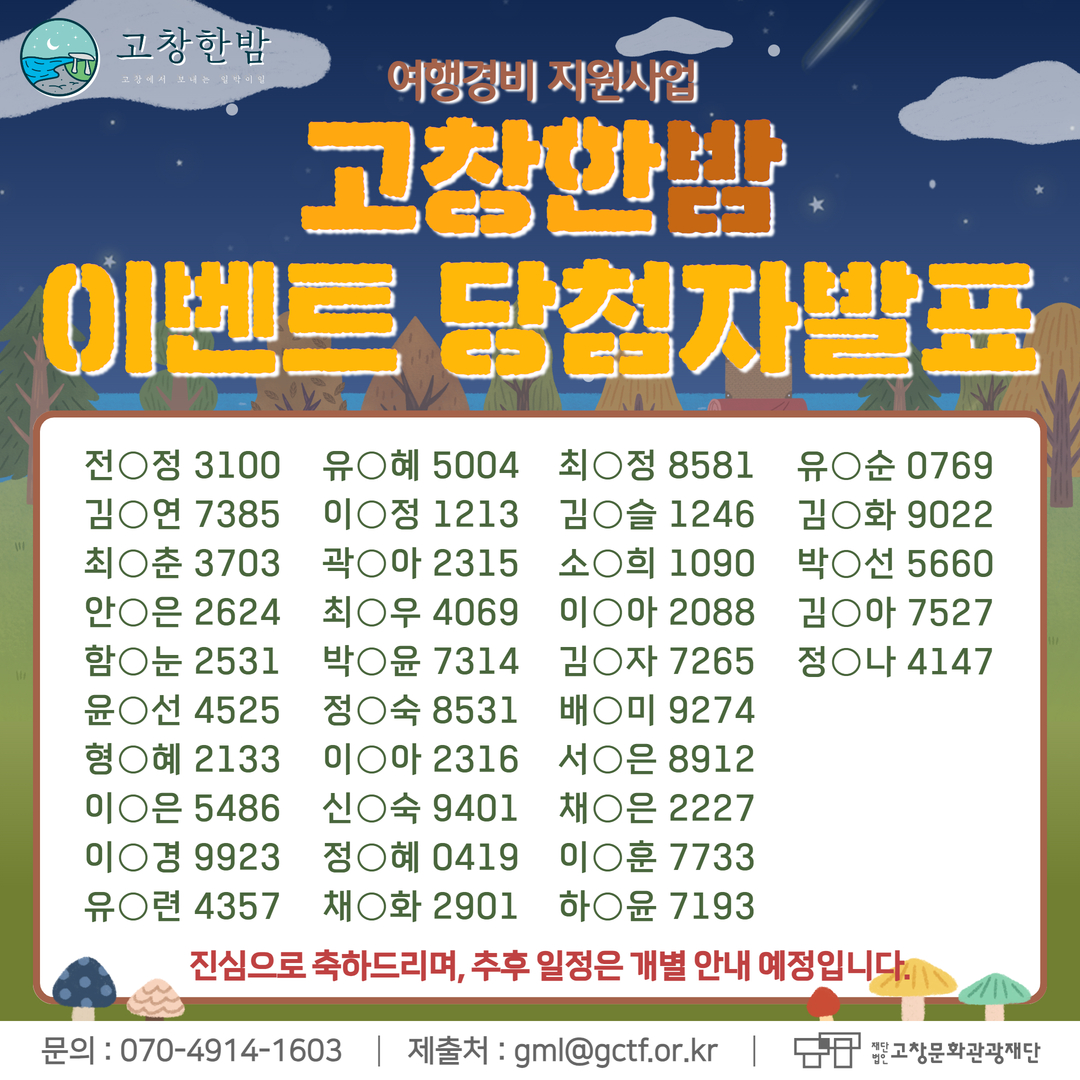 [안내] 여행경비 지원사업 '고창한밤' 미션투어 하반기 이벤트 당첨자 발표