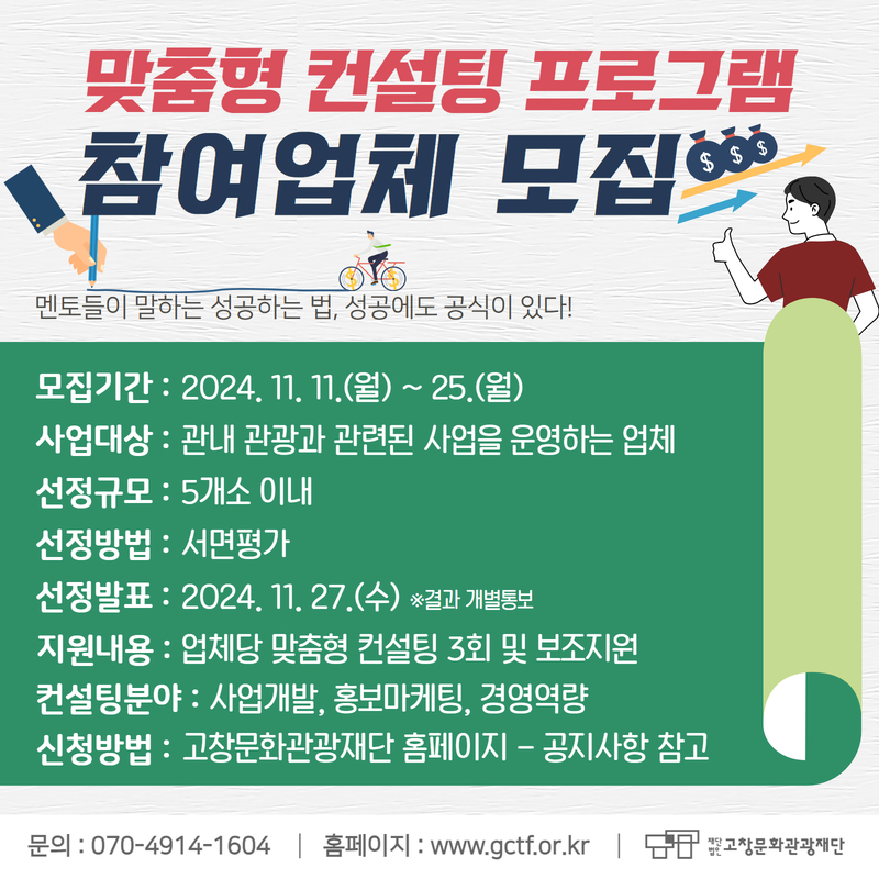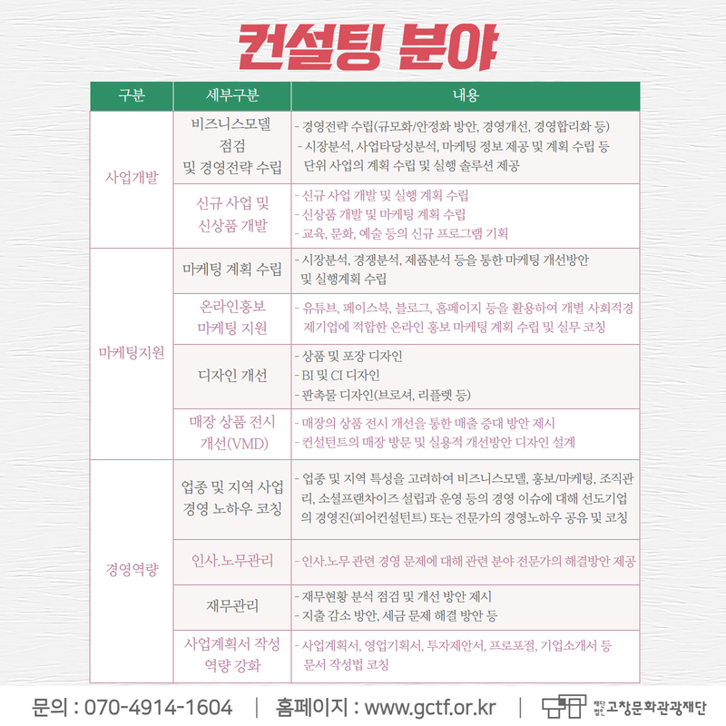 (재)고창문화관광재단은 고창군의 관광산업 경쟁력 강화를 위해 고창 지역의 관광과 관련된 사업을 하는 업체(숙박업, 음식업, 체험업 등)를 대상으로 맞춤형 컨설팅 프로그램을 운영합니다. 본 프로그램은 각 업체의 서비스 개선과 운영 효율성을 높이고, 고창 관광업계의 지속 가능한 성장을 지원하고자 마련되었습니다. 고창 관광업계의 발전을 함께 이끌어갈 여러분의 많은 관심과 참여 부탁드립니다.