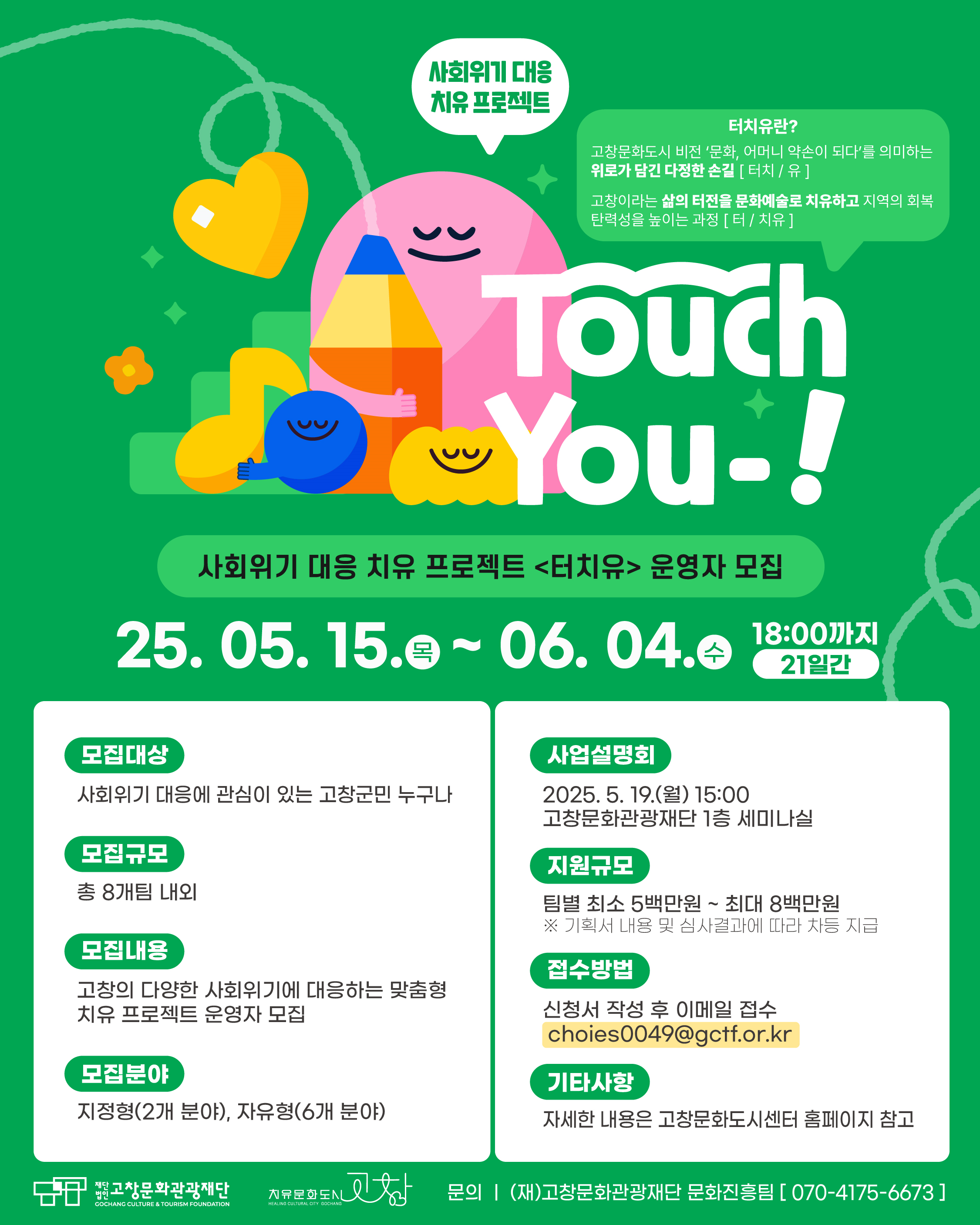 (재)고창문화관광재단·고창문화도시센터에서는 현대사회의 위기를 대응하는 고창형 치유 프로젝트 <터치유>를 추진하고 있습니다.