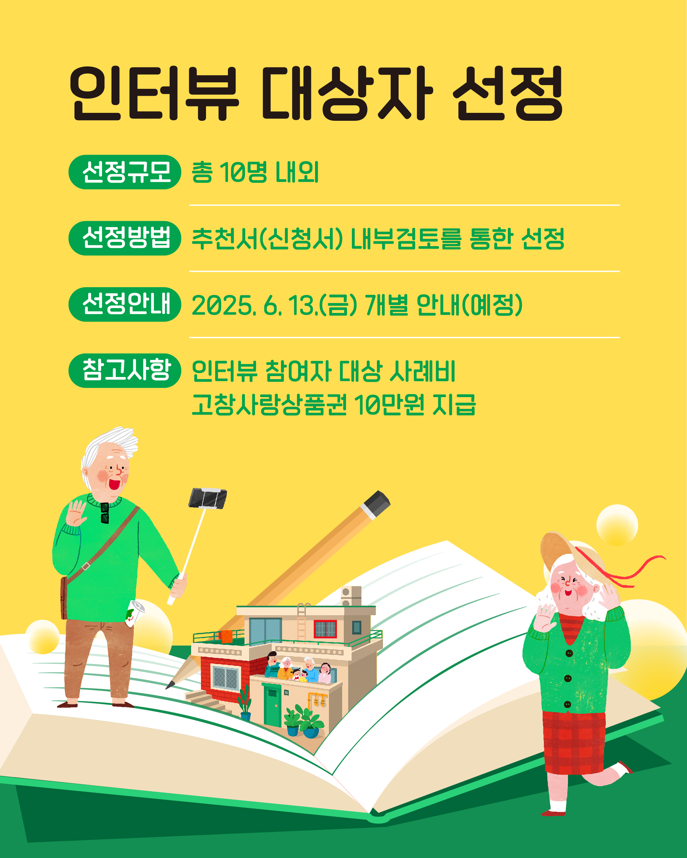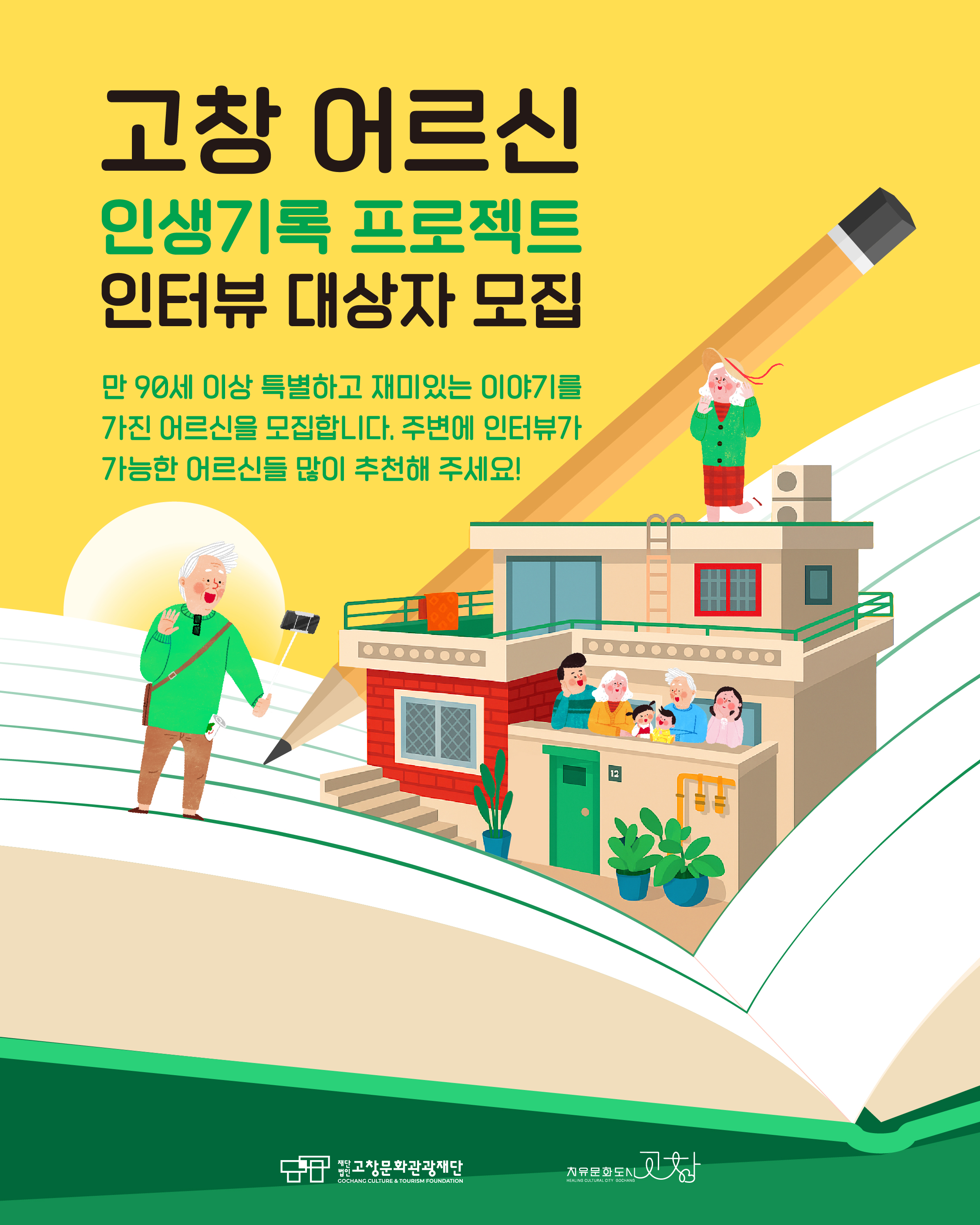 (재)고창문화관광재단·고창문화도시센터에서는 초고령 사회에 대응하여 어르신의 삶을 기록하고 의미화하는 <고창 어르신 인생기록 프로젝트>를 추진하고 있습니다. 이와 관련하여 다양하고 특별한 이야기를 가진 어르신을 모집하고자 하니 많은 관심과 신청(추천) 바랍니다.