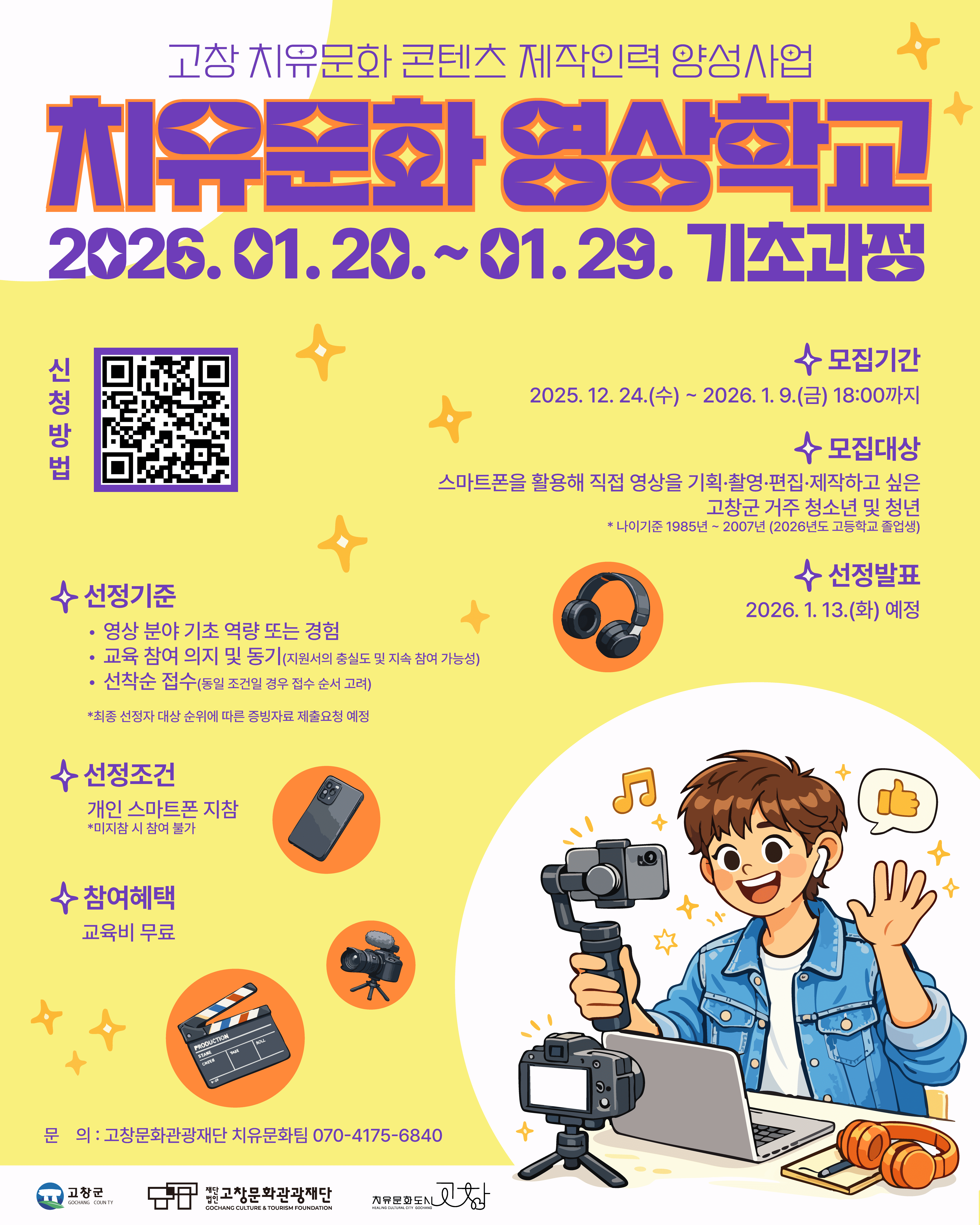[공고 제2025-120호] 2025 고창 치유문화 콘텐츠 제작인력 양성사업 치유문화 영상학교 기초과정 참여자 모집 공고