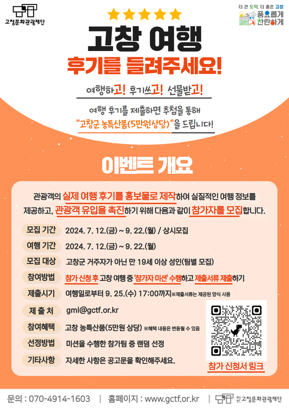 고창문화관광재단(이사장 심덕섭)은 오는 7월 12일부터 9월 22일까지 고창 관광 활성화를 위한 특별 이벤트 ‘고창 여행의 후기를 들려주세요!’ 이벤트를 진행한다고 밝혔다.