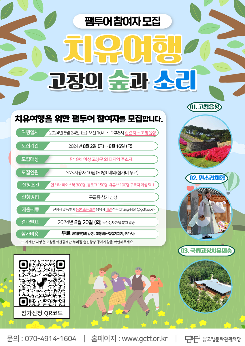 이번 팸투어는 24일에 진행되며 고창 생물권 스토리텔러와 고창읍성 투어, 소리꾼 2명과 판소리 체험, 산림치유지도사와 국립 고창 치유의 숲 산림치유 프로그램 체험을 진행하는 일정으로 참가비는 무료이다.