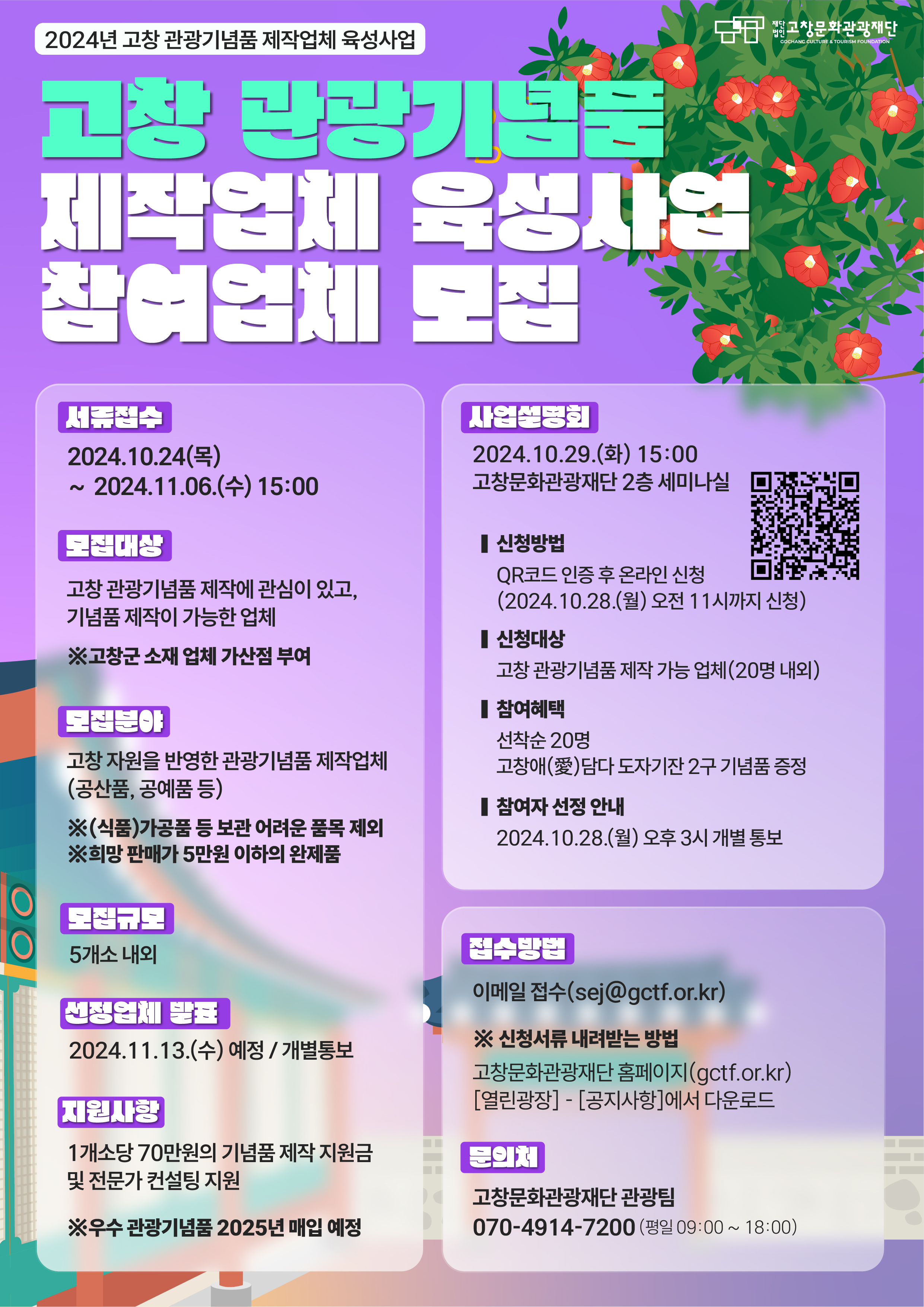 고창문화관광재단(이사장 심덕섭)은 지역의 특색과 상징이 담긴 관광기념품 발굴을 위해 ‘2024년 고창 관광기념품 제작업체 육성 사업’ 참여업체를 10월 24일부터 11월 6일까지 14일간 모집한다.