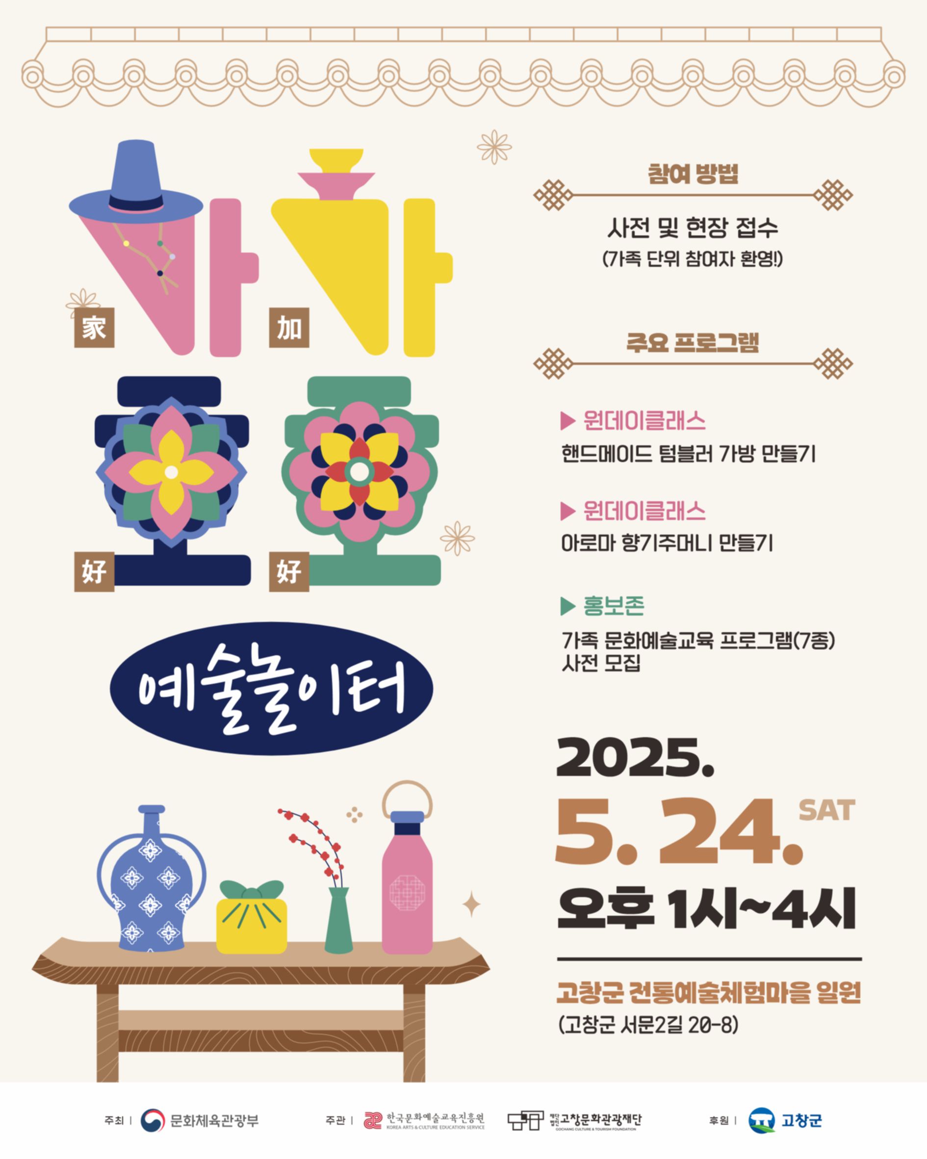 고창문화관광재단(이사장 심덕섭)은 문화체육관광부가 주최하고 한국문화예술교육진흥원과 고창문화관광재단이 주관하는 2025 생활밀착형 문화예술교육 지원사업 ‘가가호호’(이하 가가호호)의 첫 시작을 알리는 ’가가호호 예술놀이터‘가 오는 5월 24일 고창군 전통예술체험마을에서 열린다.