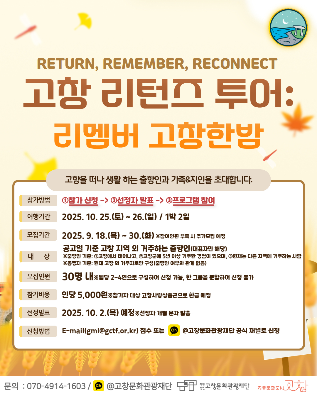 조창환 고창문화관광재단 상임이사는 “이번 ‘고창 리턴즈 투어: 리멤버 고창한밤’은 출향인과 가족이 함께 고향의 매력을 다시 체험하며 정서적 유대를 이어가는 소중한 기회가 될 것”이라며, “많은 출향인 분들이 함께해 고창의 가을을 즐기고 따뜻한 추억을 남기길 바란다”고 전했다.