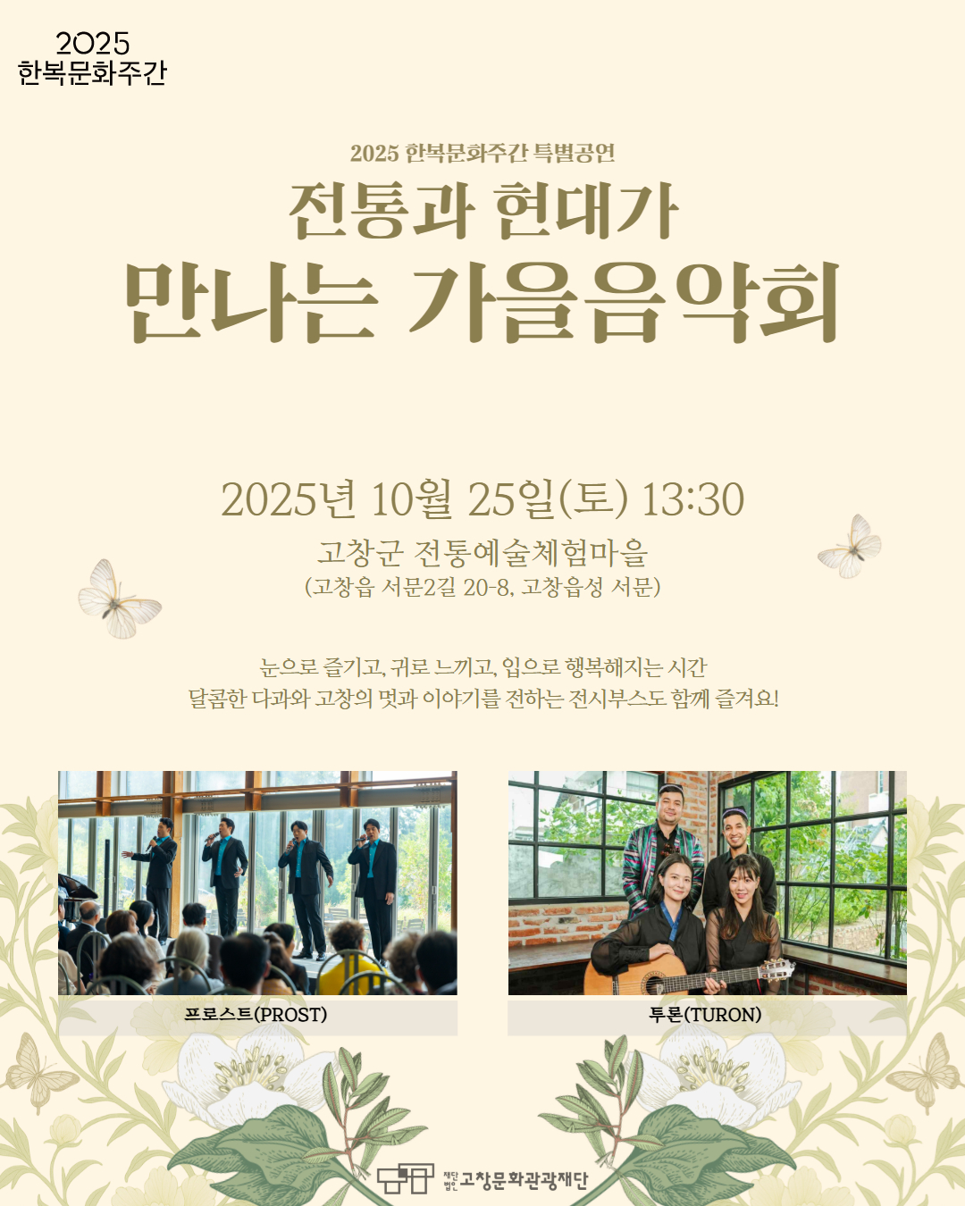 1부에서는 감미로운 팝페라 앙상블 프로스트(PROST)가 고창의 가을 정취를 담은 클래식 공연을 선사하고, 2부에서는 아시아월드뮤직 그룹 투론(TURON)이 세계적인 음악 색채와 리듬으로 고창의 자연과 어우러지는 무대를 선보인다.