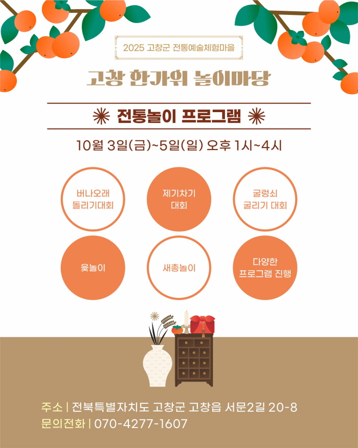 고창문화관광재단(이하 재단)은 오는 10월 3일부터 5일까지 3일간 고창군 전통예술체험마을에서 추석 전통놀이 체험행사 ‘고창 한가위 놀이마당’을 운영한다고 밝혔다.